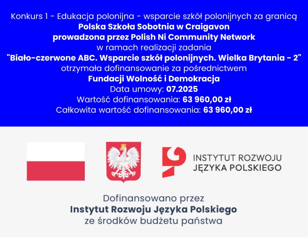 Dziękujemy za okazane zaufanie oraz wsparcie naszej działalności na rzecz promocji języka polskiego i kultury w Irlandii Północnej. Dzięki tym środkom będziemy mogli kontynuować działalność Polskiej Szkoły Sobotniej w Craigavon oraz realizować nasze projekty, które pozwolą jeszcze skuteczniej integrować polską społeczność oraz przybliżać polskie tradycje lokalnym mieszkańcom.